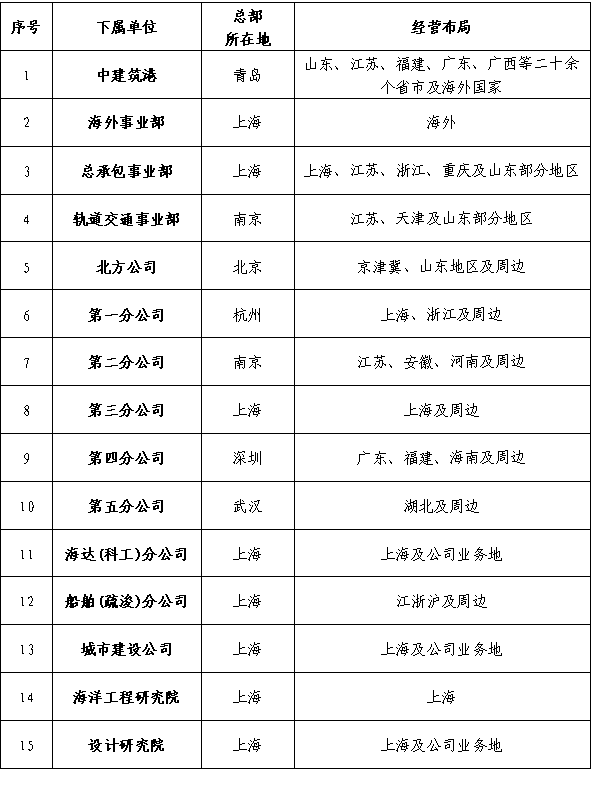 公司坚持“一主多元”业务模式,形成水工特色鲜明、市政优势显著、房建强力支撑、路桥特点突出的综合发展模式,经营范围遍布全国二十余个省、市、自治区。近年来,公司以主力军身份承建了上海国际航运中心洋山深水港、上海外高桥港、青岛董家口港、天津港、武汉阳逻港、广西防城港、深圳盐田港、河北黄骅港等港口建设;参与了海南西环铁路、沈丹客运专线、青岛地铁8号线、天津地铁6号线、南京地铁7号线等项目;积极践行“一带一路”倡议,承担了吉布提多哈雷港、印尼巴厘岛燃煤电厂码头、以色列海法港等境外项目以及军民融合等项目建设;牢记“国之大者”,彰显“央企担当”,积极投身于西部陆海新通道(平陆)运河航道工程、中船集团760研究所三亚某基地(一期)建设码头、印尼北加项目永久码头等一批海内、外重点工程项目建设,持续塑强“中建海军”品牌。