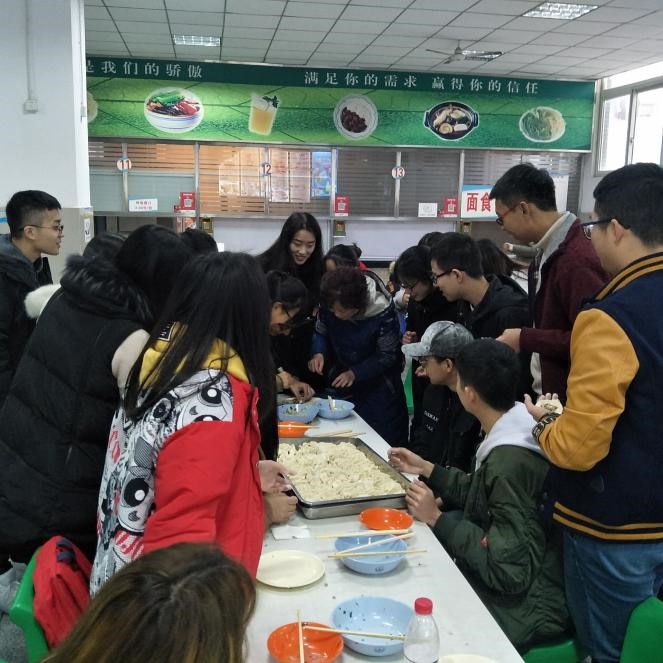 包完饺子便是等待饺子出锅的艰难时刻,等待美味的15分钟里,团支书组织同学们通过“精准扶贫”、“打地主”活动保证各个小组的粮票数量平衡,不至于太多浪费饺子,也不会太少导致同学吃不饱。终于,饺子带着热气出锅了!这是第一次大家吃到班级一起亲手包的饺子,也是第一次班级所有成员都坐在食堂里一起吃饺子。同学们埋头吃着饺子,不时抬头夸奖几句:“这个饺子一定不是我包的!它太好看啦。”