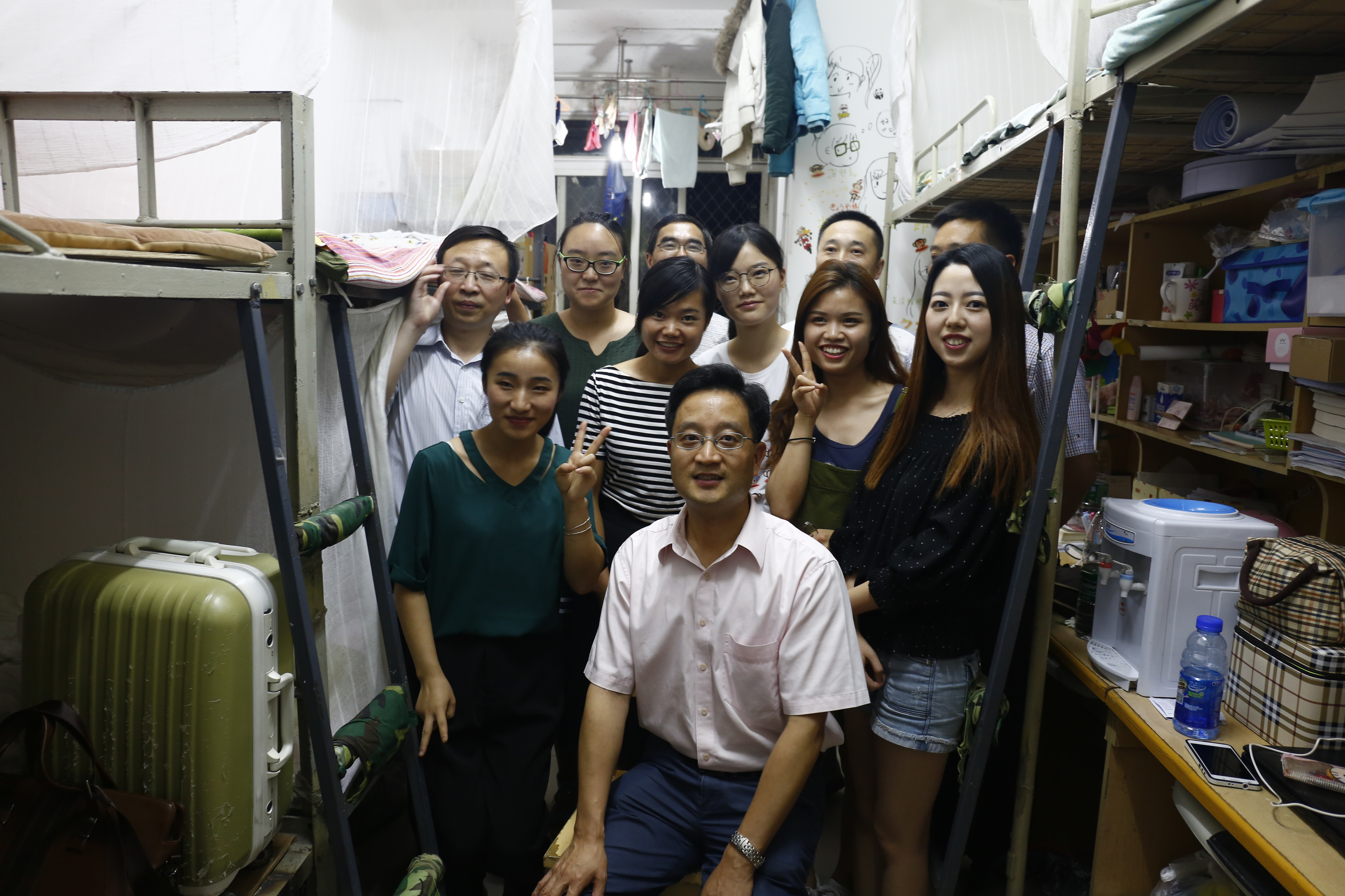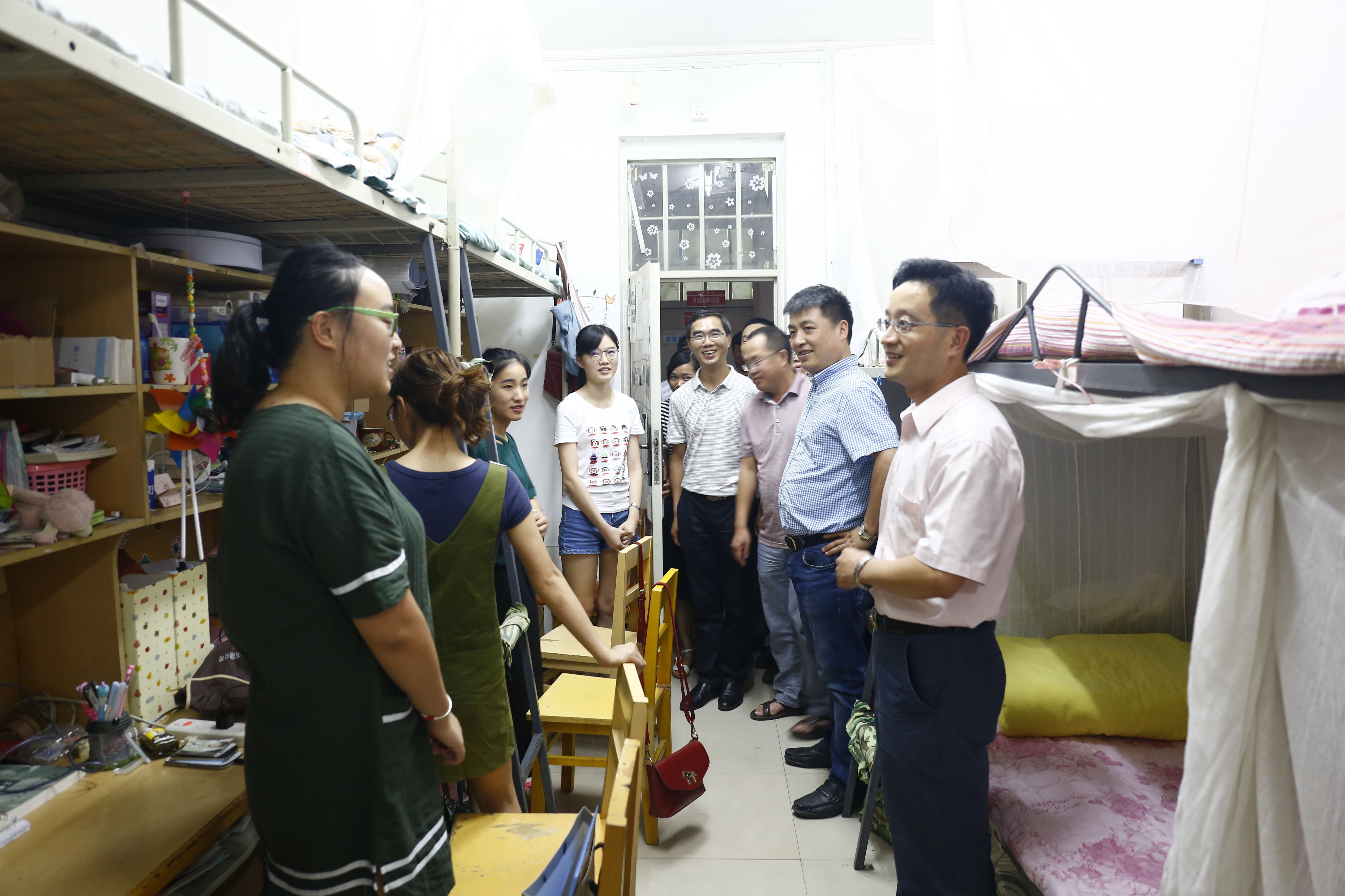 毕业生寝室,走访慰问学生,与毕业生谈心交流。