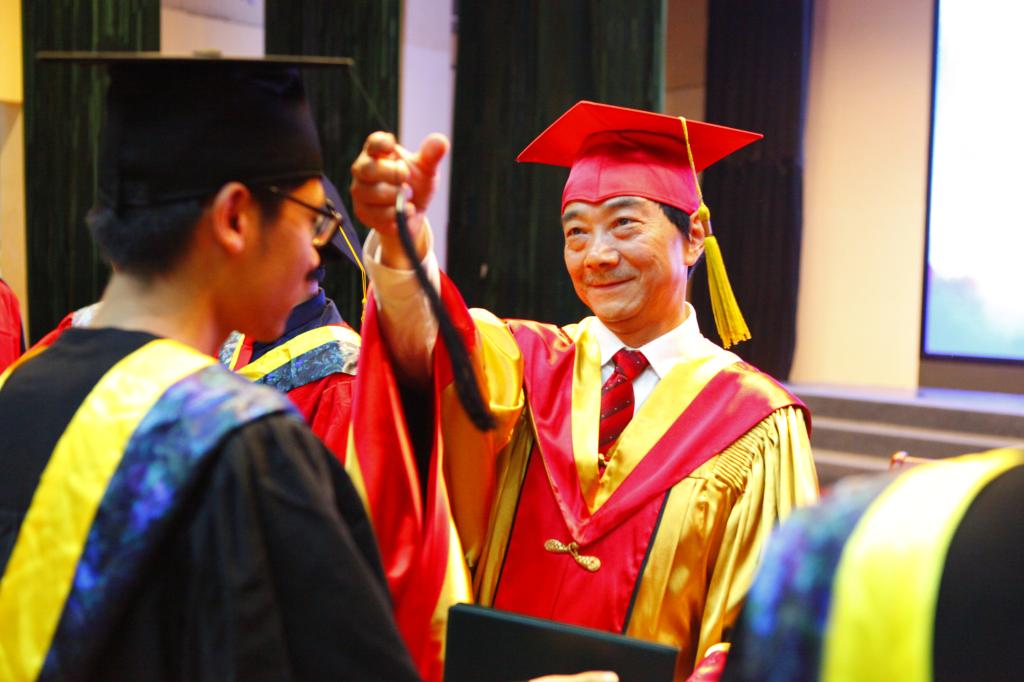 毕业典礼暨授位仪式在庄严的国歌中拉开序幕。学院院长、校学位评定委员会委员、院学位评定分委员会主席曹云忠教授致辞,祝福2018届毕业生顺利获得学位。他说,在川农的四、五年,同学们不断探索、勇于实践和创新,在科学研究、创新创业、综合素质能力等多方面取得了长足的进步。希望毕业生在未来的人生道路上,以积极平和的心态去面对所遇到到成功与挫折,并懂得感恩、勇于担当。