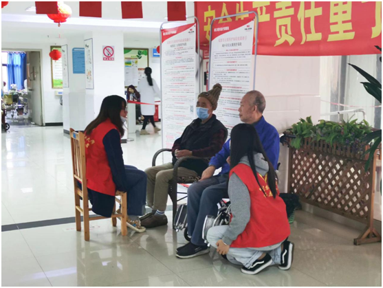 的志愿者们于都江堰市杰琳康复医院准时开展志愿者活动。志愿者们先是热情的微笑着与老人交谈,之后便给老人按摩,陪老人看电视,写毛笔字。老人们面对志愿者们的到来,愿意敞开心扉,与玩偶姐姐