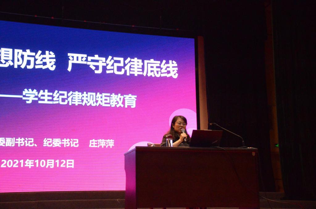 在学生活动中心开展了以“筑牢思想防线、严守纪律底线”为主题的纪律规矩教育专题讲座。本次讲座由学院党委副书记、纪委书记庄萍萍主讲,她从大学生纪律规矩的重要性、当代大学生纪律规矩意识现状、纪律规矩教育的主要内容、如何加强纪律规矩意识的培养等方面展开。全体大一新生、高年级各班学生代表及研究生代表共500余人参加讲座。