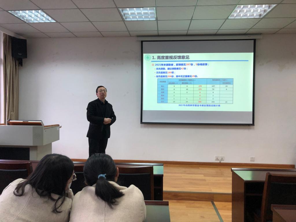 曹云忠以“巩固深耕齐努力 跃马扬鞭创辉煌”为主题,从成绩、潜力、工作安排三个方面为申报工作做出总体要求,介绍了2021年基金申报总体情况,深入探析了申报中存在的问题,鼓励和要求博士学历的青年教师,聚焦研究方向,2022年应报尽报,学院将在经费、组织工作和奖励上给予充分支持。党委书记申琼强调,每位老师要把握好“十四五”规划的机遇和挑战,吃透学校政策文件,重视团队建设,找准研究热点,力争突破。行政办负责人介绍了科技奖项申报和后续奖励资助情况,解读了学校《学科建设双支计划》、《教师工作业绩评分标准》等文件。