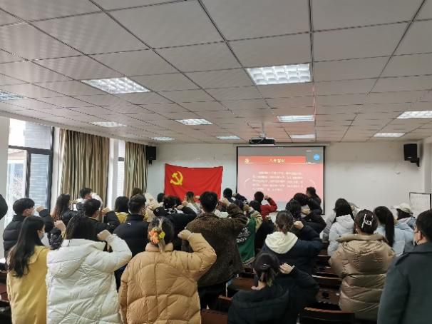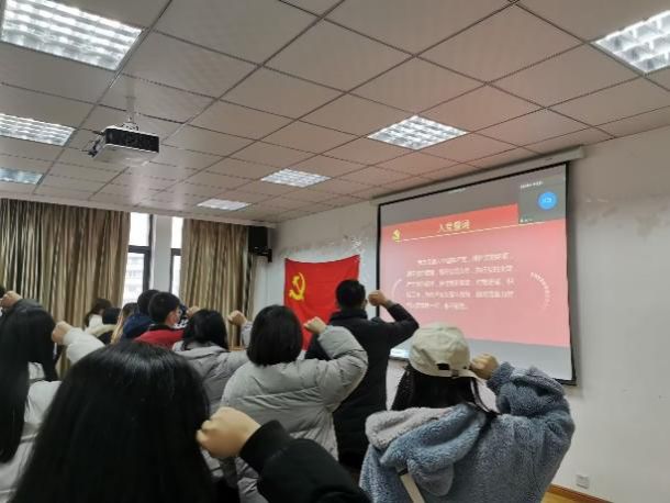 新党员入党宣誓仪式在学院会议室2C405举行。学院团委副书记兼党委办公室副主任周宁和新发展的中共预备党员通过线下结合线上的方式参会,宣誓仪式由学院学生党建办公室主任吴红玉主持。
