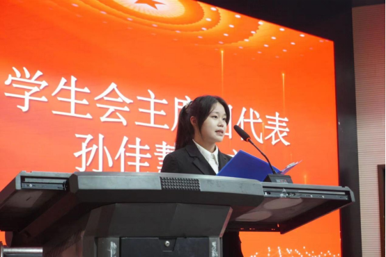 第十届学生会主席团代表孙佳慧做述职报告,她回顾了学生会的工作成果,并明确了玩偶姐姐