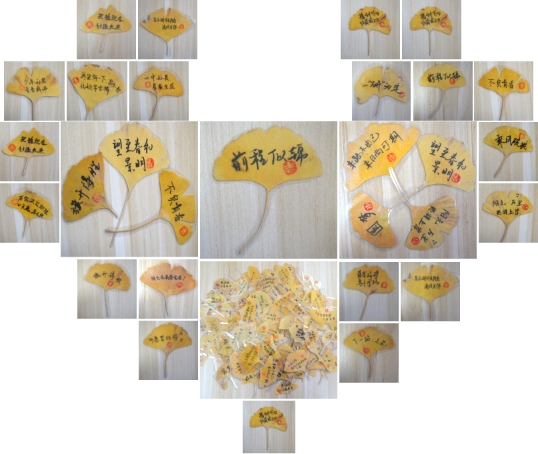的研究生们用秀丽笔书写上了鼓舞人心的考研祝福,再用特制的黄铜印章为银杏叶盖上了幸运章。银杏叶经过精心塑封,成为了独具寓意的祝福礼物。每一片“杏”都承载了最真挚的祝福与鼓励,期待在看似平凡的日子里积累的力量,终如银杏叶一般,在考研学子的前行之路上照亮他们的努力与坚持。