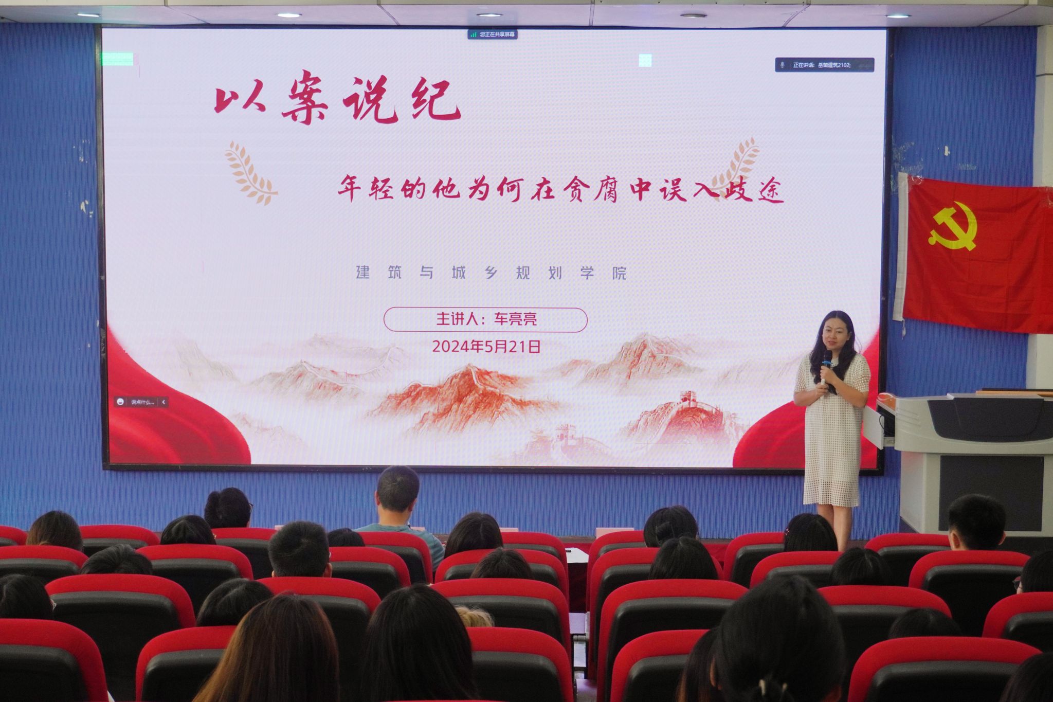 于4101开展辅导员公开课第7季——《以案说纪——年轻的他为何在贪腐中误入歧途》,引领青年学生党员遵规守纪,扣好廉洁从业的第一粒扣子。学院纪委委员、教工党群支部书记、就业秘书车亮亮老师主讲,全院150余名学生党员参加。