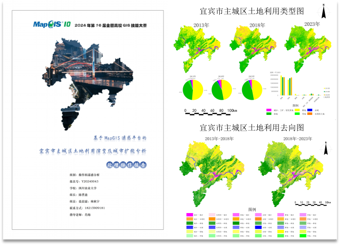 其中,陈曹鑫、蓝晨霖团队的遥感分析作品《基于MapGIS遥感平台的宜宾市主城区土地利用演变及城市扩张分析》利用遥感分析原理和技术对四川省宜宾市主城区近十年的土地利用的演变规律和城市扩张趋势进行了深入分析,为城市规划和土地管理提供了科学依据;李佳昕、王诗怡团队的矢量制图作品《长安故里》,以长安古城为背景,运用GIS技术细致解读了古城的历史演变与文化遗产,展现了古城的历史风貌与文化价值;王诗怡、李佳昕、彭柏彤、龚艾媛团队的制图作品《刺桐古韵,海丝新章--东亚文化之都·泉州地图纪行》以海上丝绸之路泉州作为切入点,通过SuperMap软件制图,对泉州的历史文化和现代发展进行了全面展示,呈现了一幅幅生动的泉州地图。