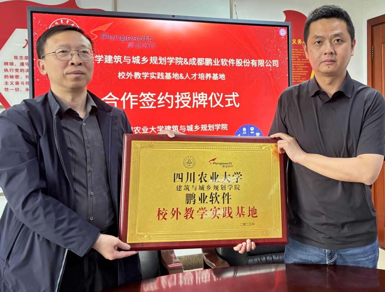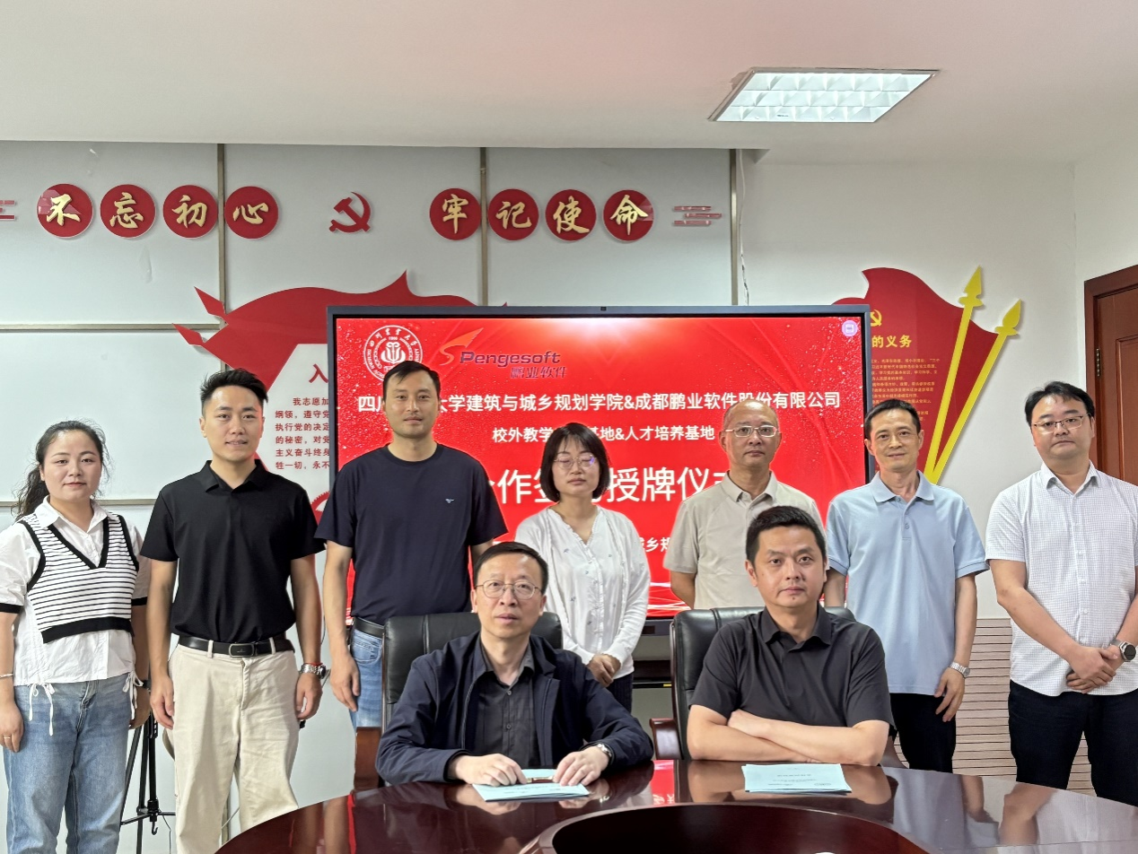 与成都鹏业软件股份有限公司在都江堰校区5409会议室举行校企合作签约暨授牌仪式。此次合作标志着双方将在教学实践、人才培养和产教融合等多个方面深入合作,共同打造“教学实践基地”和“人才培养基地”。