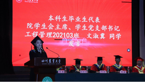 承吾校训,爱我山河。院学生会主席、学生党支部书记、工程管理202103班文淑冀同学代表本科毕业生发言。本科在读期间,文淑冀在挑战中蜕变,将爱国敬业融入个人,站在毕业典礼的现场展望未来。
