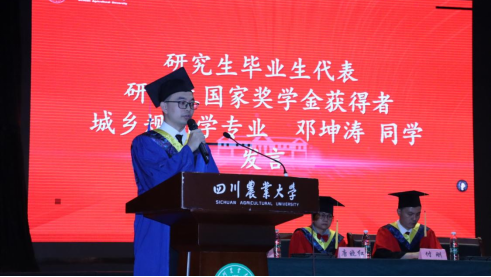 黄领披肩,蓝袍加身。国家奖学金获得者、城乡规划学专业邓坤涛同学代表研究生毕业生发言。他感恩在川农走过的岁月,对校园、师长及后勤工作者们表示衷心感谢。