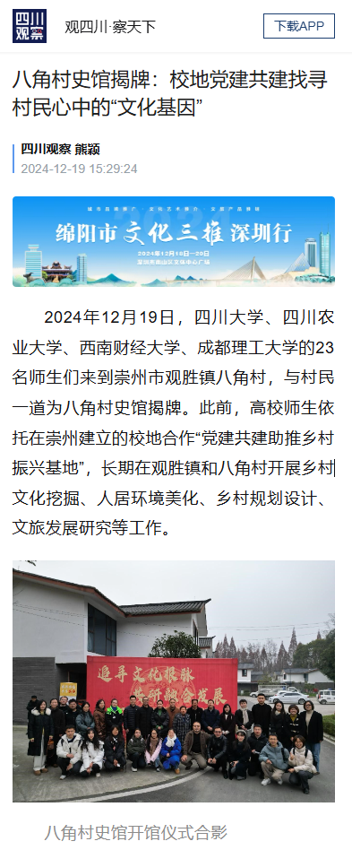 、西南财经大学、成都理工大学的23名师生们来到崇州市观胜镇八角村,与村民一道为八角村史馆揭牌。此前,高校师生依托在崇州建立的校地合作“党建共建助推乡村振兴基地”,长期在观胜镇和八角村开展乡村文化挖掘、人居环境美化、乡村规划设计、文旅发展研究等工作。