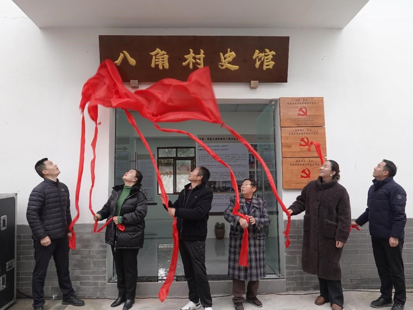 村民代表、高校代表、镇领导为八角村史馆揭牌