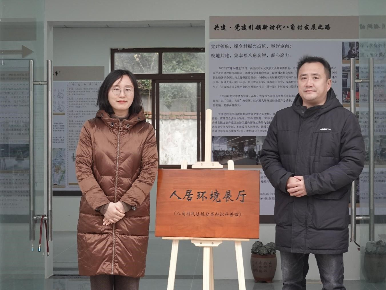 崇州市城市管理和综合行政执法局副局长邵志强、观胜镇党委委员章婵丽为八角村人居展厅揭牌