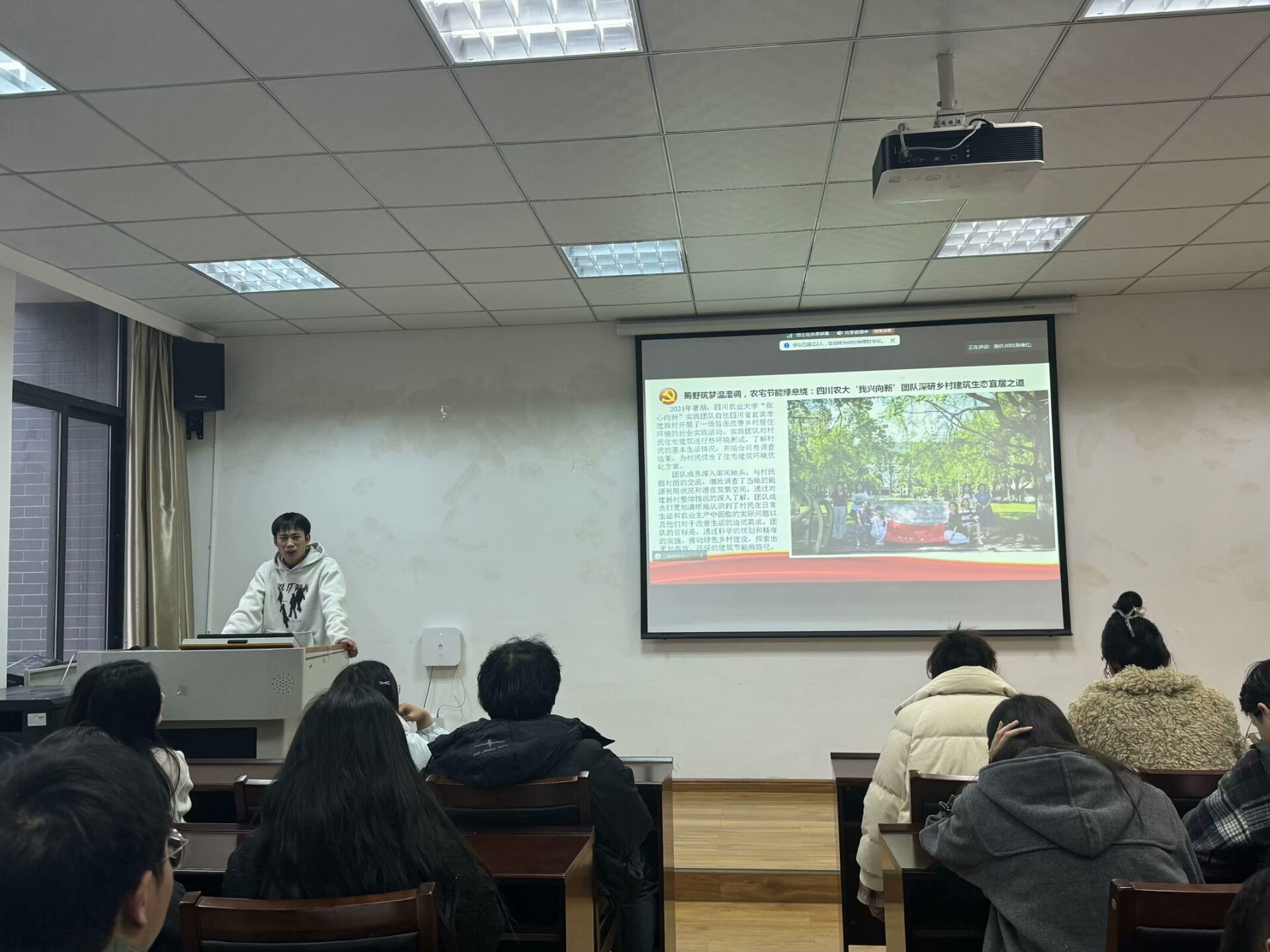 在经验分享环节,聚焦于绿色乡村和农村基础设施建设,代永兴、范扬艺两名同学分别结合自身实践经历,深入分析当前在“三农”政策指导下的乡村振兴事业的进展与挑战,探索更加高效、环保的建筑节能新路径,推动城乡之间的均衡协调发展。