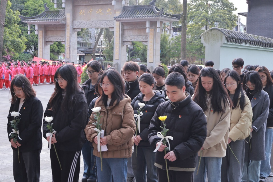 上午8时,全体党员佩戴党徽,列队从学校活动中心出发,徒步前往烈士陵园。青松掩映的烈士纪念碑前,支部书记带领全体党员整装肃立,面向纪念碑深切缅怀革命先驱。致辞中,支部书记以历史脉络串联英烈事迹,指出此次活动是追溯精神根脉的实践教育,勉励青年党员将先烈精神转化为服务城乡发展的行动自觉。随后,三名代表分别讲述了辛亥先驱张捷先组织保路同志军反抗封建压迫,地下党员干希宇隐姓埋名开展革命工作,抗震英雄武文斌用生命守护群众安全的感人事迹。现场党员垂首静立,向用鲜血与生命铺就复兴之路的先驱者致以崇高敬意。全体人员肃立默哀三分钟,并依次向烈士纪念碑敬献鲜花,寄托对英烈的无限追思。