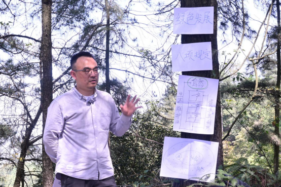 午后学院党委委员张凌青在林间开讲专题党课。他以“绿色发展理念与中央八项规定精神”为切入点,阐释“厉行节约”与“生态保护”的内在关联。他强调,城乡规划党员需以“一草一木总关情”的敬畏之心,将生态红线意识与节俭理念融入专业实践,并呼吁学生党员跳出专业局限,以“命运共同体”的格局践行节约资源、守护生态的使命,将个体行动融入人与自然和谐共生的时代命题。党员们席地而坐,聆听中频频记录,将“厉行节约、绿色发展”的理念深植于心。随后的专题研讨中,师生分组围绕“绿色生活学习方式”展开热烈讨论并汇报讨论结果。