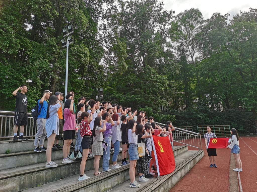 紧接着,学党史小游戏和重温入团仪式在操场展开。再通过你画我猜环节猜提词板上与党有关的词语来学习党的知识之后,同学们更加积极投入党史问答竞赛,对党史都拥有了一定的熟悉程度。最后通过与党旗合影以及重温入团仪式等活动圆满结束了本次的团组织生活。
