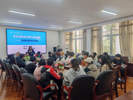 为增强大学生自我认知,明确职业目标,提升就业竞争力,10 月 24 日下午,2023级工程管理2班全体同学在班主任刘西老师的带领下在4202 会议室,开展了一场以“发现和提升职业技能”为题的大学生职业规划团队辅导。