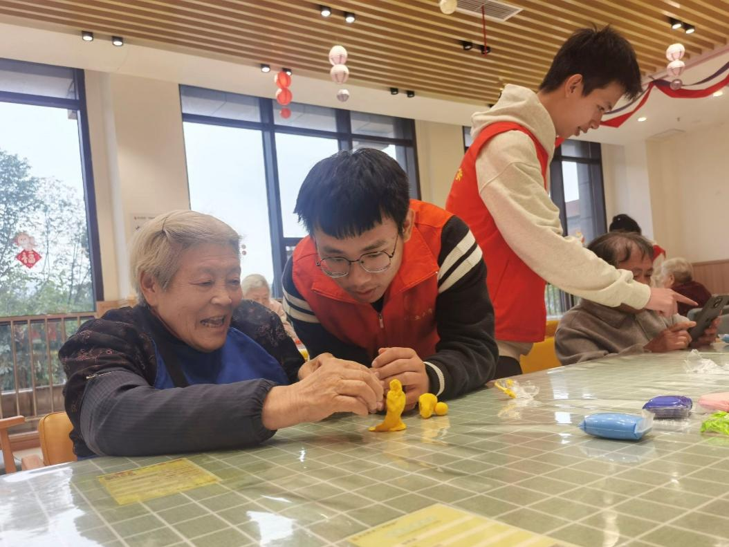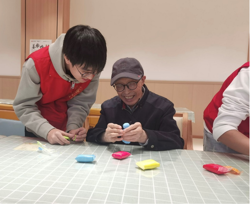 “爷爷您好呀,看看这团软软的黏土,是不是很像年轻时捏过的泥巴呢?” 志愿者张同学笑容灿烂,手持一块彩色黏土,向老人耐心示范,通过浅显通俗的语言教学讲解黏土的基本操作技巧,让长辈格外放松、倍感亲切。