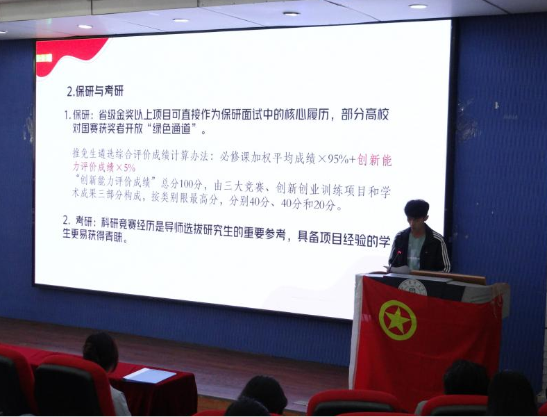 在科创赛事解析环节,团委科创中心负责人王鹏伟系统梳理了"挑战杯""中国国际大学生创新大赛"等重点赛事的培育周期与参赛流程,着重介绍了各种赛事的赛道类别以及项目转化。活动特别设置互动答疑环节,与参会学生就团队组建、成果凝练等具体问题与主讲人展开深入交流。