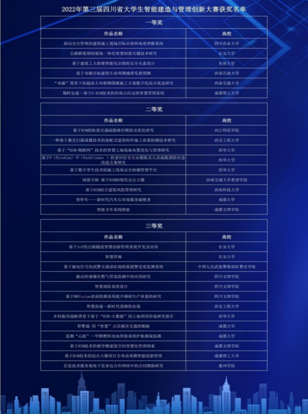 据悉,本次大赛以“智能建造与管理创新”为主题,鼓励参赛作品应用BIM、物联网、大数据、人工智能、虚拟仿真等信息技术研究工程管理领域问题。比赛分为初赛、复赛、决赛三个阶段。共有46支队伍进入复赛,28支队伍进入决赛。大赛共设置一等奖6名、二等奖9名、三等奖13名。